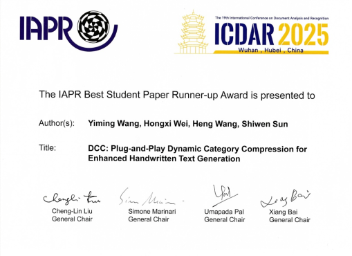 ICDAR(International Conference on Document Analysis and Recognition,简称ICDAR)是国际模式识别学会在文档分析与识别领域的旗舰会议。ICDAR 2025于9月16日-21日在武汉召开,本次会议共收到有效投稿论文314篇,最终40篇论文被录用为口头汇报(录用率12.7%),102篇论文被录用为海报展示(录用率32.5%)。人工智能学院2023级博士生王一明与其导师魏宏喜教授合作的2篇论文“DCC:Plug-and-Play Dynamic Category Compression for Enhanced Handwritten Text Generation”和“VMF-Net: Visual-Aware Multi-representation Fusion Network for Artifact-Free Handwritten Mathematical Expressions Generation”,分别荣获最佳学生论文亚军奖(Best Student Paper Runner-up Award)和最佳海报亚军奖(Best Poster Runner-up Award)。
