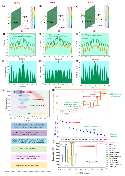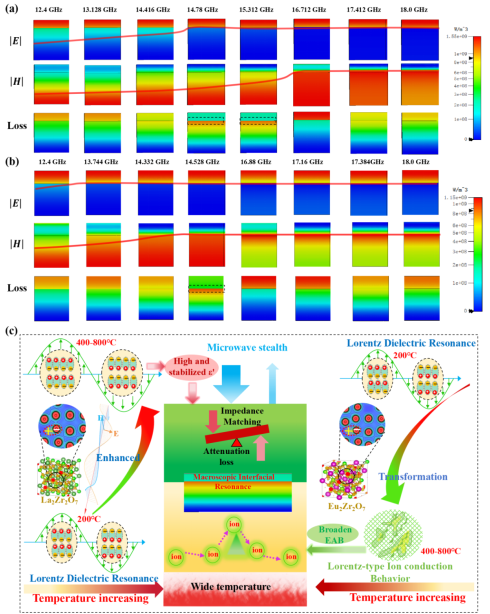 研究团队的核心创新在于选取具有八分之一本征阴离子位空位的稀土锆酸盐陶瓷锆酸镧(La2Zr2O7)和锆酸铕(Eu2Zr2O7),采用双层异质结构设计来解决上述问题。由氧离子激活的热离子弛豫极化与洛伦兹介电共振之间的平衡可以在不同温度下显著提高La2Zr2O7的介电常数实部,同时保持其稳定性;同时,强热离子传输诱导Eu2Zr2O7的介电损耗能力增加,从而有效拓宽吸收带宽(EAB)。此外,双层结构层间的宏观界面共振克服了四分之一波长理论的限制,产生了新吸收峰,从而进一步扩展带宽。在这些机制的协同耦合下,成功实现了卓越的有效吸收带宽:在超薄固定厚度仅为1.2 mm的情况下,-5 dB吸收带宽完全覆盖了Ku波段,并且在宽温度范围(400–800 °C)内实现了最大EAB/d为3.6 GHz mm−1。这种创新设计为开发超薄且宽温度适应的微波吸收材料提供了一种创新视角。