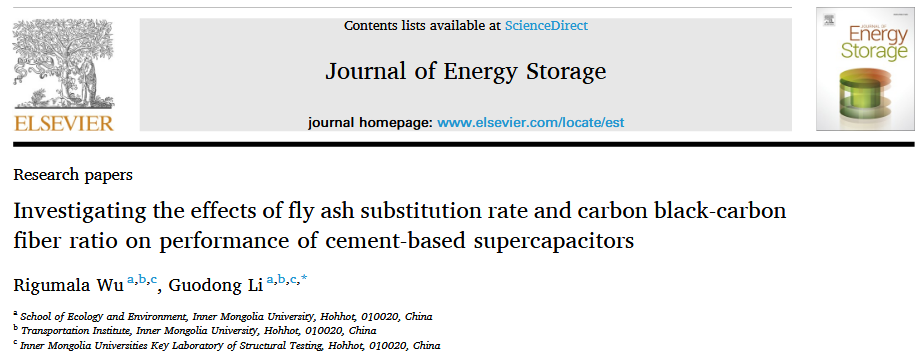 近日,我校交通学院李国栋教授团队在Journal of Energy Storage期刊上发表了题为“Investigating the effects of fly ash substitution rate and carbon black-carbon fiber ratio on performance of cement-based supercapacitors”的论文,团队成功制备出了含粉煤灰的储能混凝土,为结构超级电容器电极的研究提供了新方向。